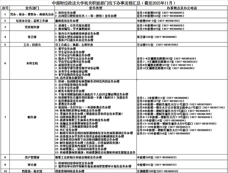 为持续推进深入贯彻中央八项规定精神学习教育,切实加强机关作风建设,牢固树立为师生服务的理念,进一步推动校务公开,优化办事流程,提升管理服务质效,提高师生满意度,机关职能部门全面梳理本部门各项业务,201项业务上线“师生服务大厅”,另有46项线下业务汇编成册,现将相关信息挂网供师生查阅使用。